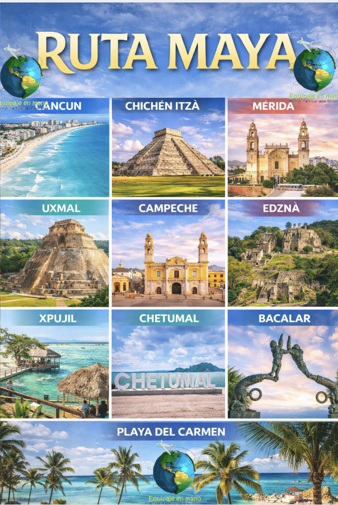 Cancún, Chichén Itzá, Mérida, Uxmal, Campeche, Edzná, Xpujil, Bacalar, Chetumal, Playa del Carmen